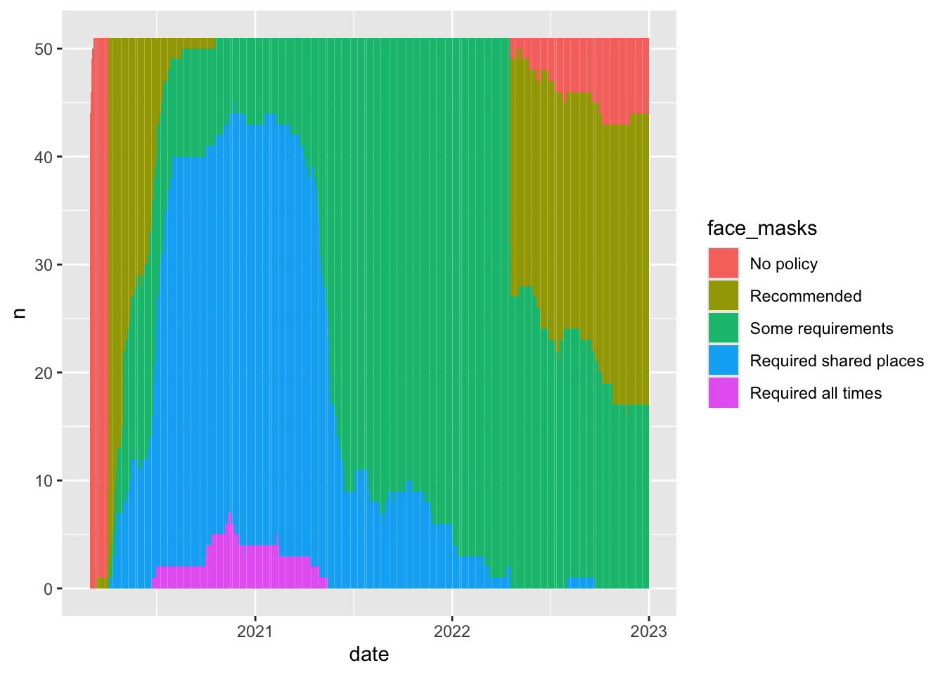 year(date) extracts the year from our date variable and saves it in new column called yearmonth(date) extracts the month from our date variable and saves it in a new column called monthpaste() command pastes these two variables together, with the str_pad() adding a leading 0 to single digit months.From the documentation of the COVID19 package, we see that the numeric values of the facial_coverings correspond to following substantive policy regimes: