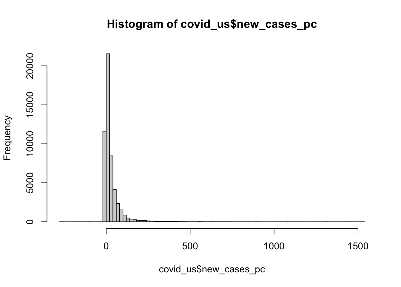 Again, let’s use the sd() function to calculate the standard deviation of the new_cases_pc variable
